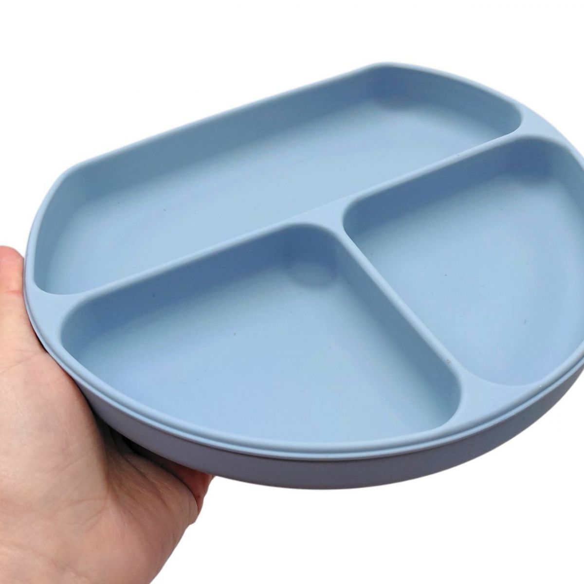 Тарілка виготовлена з харчового силікону, безпечного для дітей. Завдяки секційному поділу можна зручно розміщувати різні продукти: овочі, фрукти, каші чи інші страви.