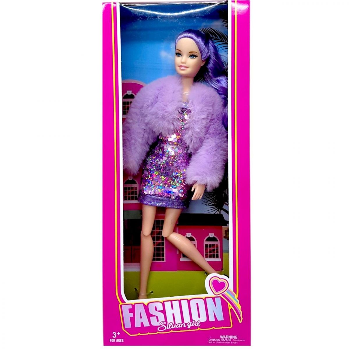 ялька у стильному бузковому вбранні — яскрава іграшка для сюжетних ігор. Модель має довге волосся, модний образ із сукнею та накидкою, а також рухомі елементи, що дозволяють змінювати пози. Підходить для дітей від 3 років, сприяє розвитку уяви, смаку до стилю та творчого мислення.
