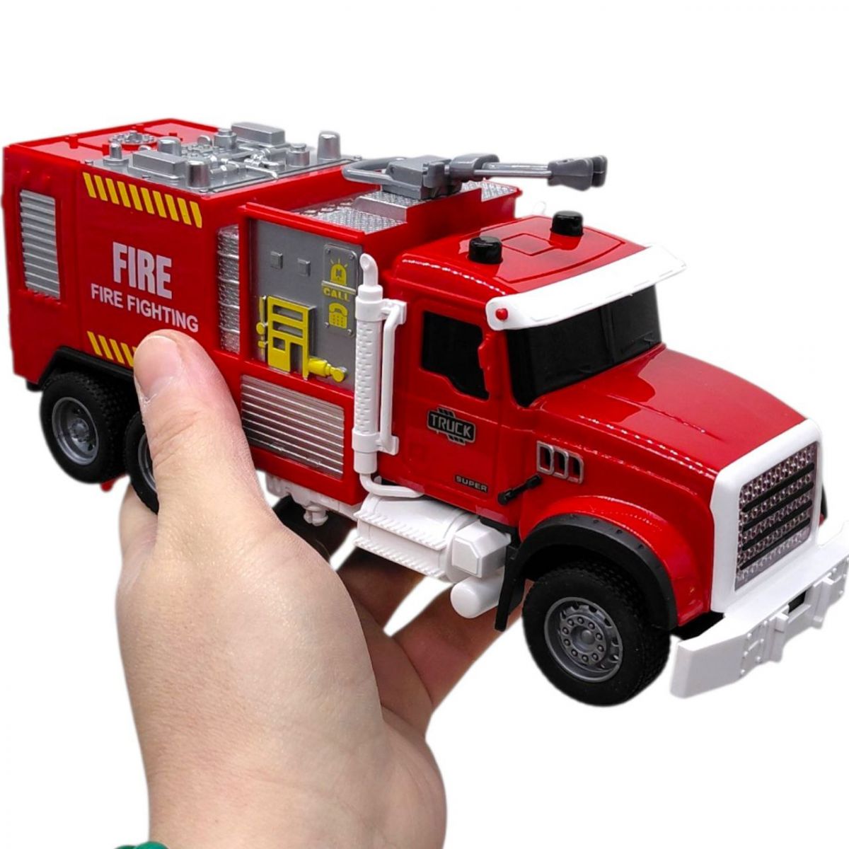 Іграшкова пожежна машина - це модель спецтранспорту з інерційним механізмом, який дозволяє машині рухатися вперед після легкого поштовху. Під час гри активуються світлові та звукові ефекти, що імітують роботу справжньої пожежної техніки.