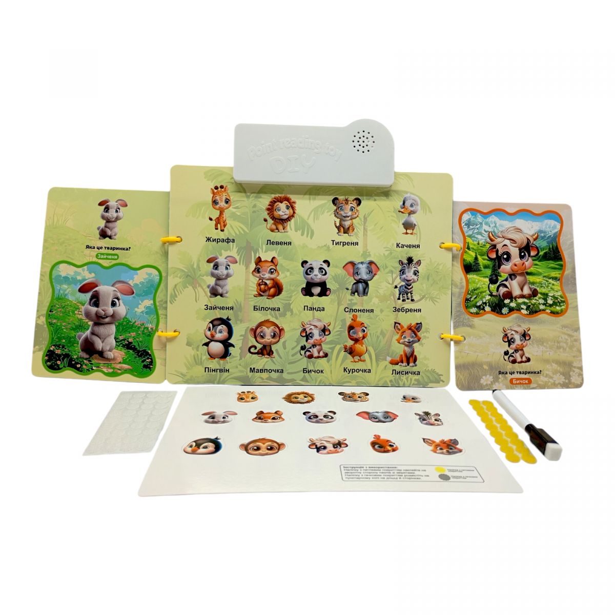 Інтерактивна книга “Світ тварин” — це захоплюючий формат навчання через гру з озвученням українською мовою. Дитина знайомиться з різними тваринами, слухає їх назви та звуки, натискаючи на елементи. Яскраві ілюстрації привертають увагу, а інтерактивні функції допомагають краще засвоювати інформацію. Іграшка сприяє розвитку мовлення, пам’яті та логічного мислення, підходить для дітей від раннього віку.
