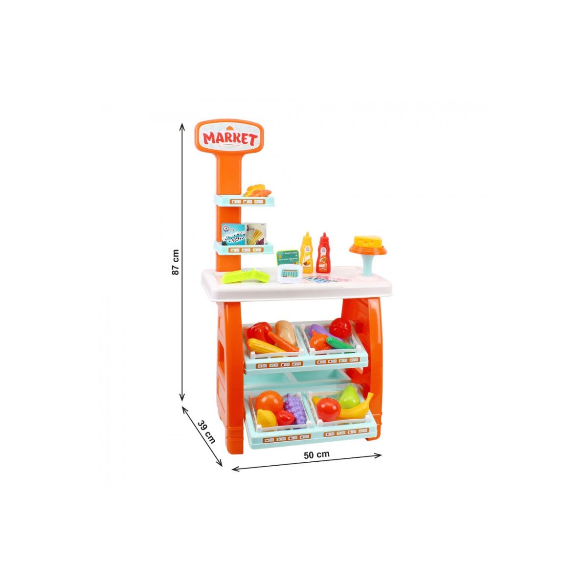 Ігровий набір «Маркет» створений для сюжетно-рольових ігор у форматі магазину. Конструкція включає торгову стійку з полицями для викладки товарів, касову зону та додаткові аксесуари.