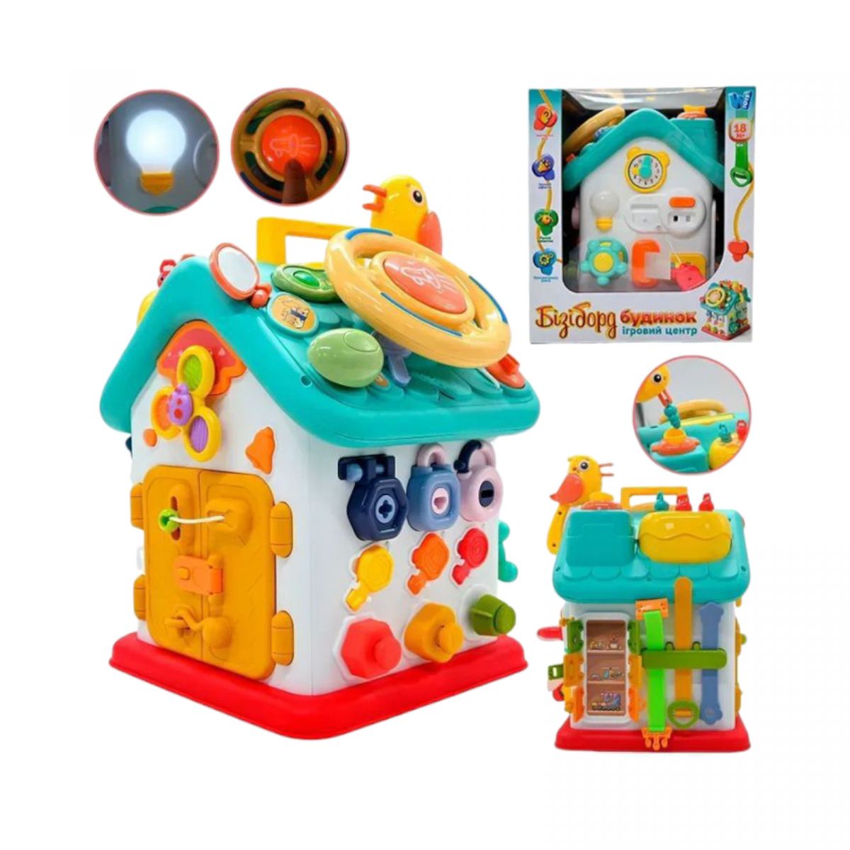 Будинок бізіборд, ОЗВУЧУВАННЯ УКРАЇНСЬКОЮ МОВОЮ, 15 казок, 15 пісень, 10 скоромовок, кермо, застібки, замки, “Нагодуй пташку”, в коробці Wtoys 62638