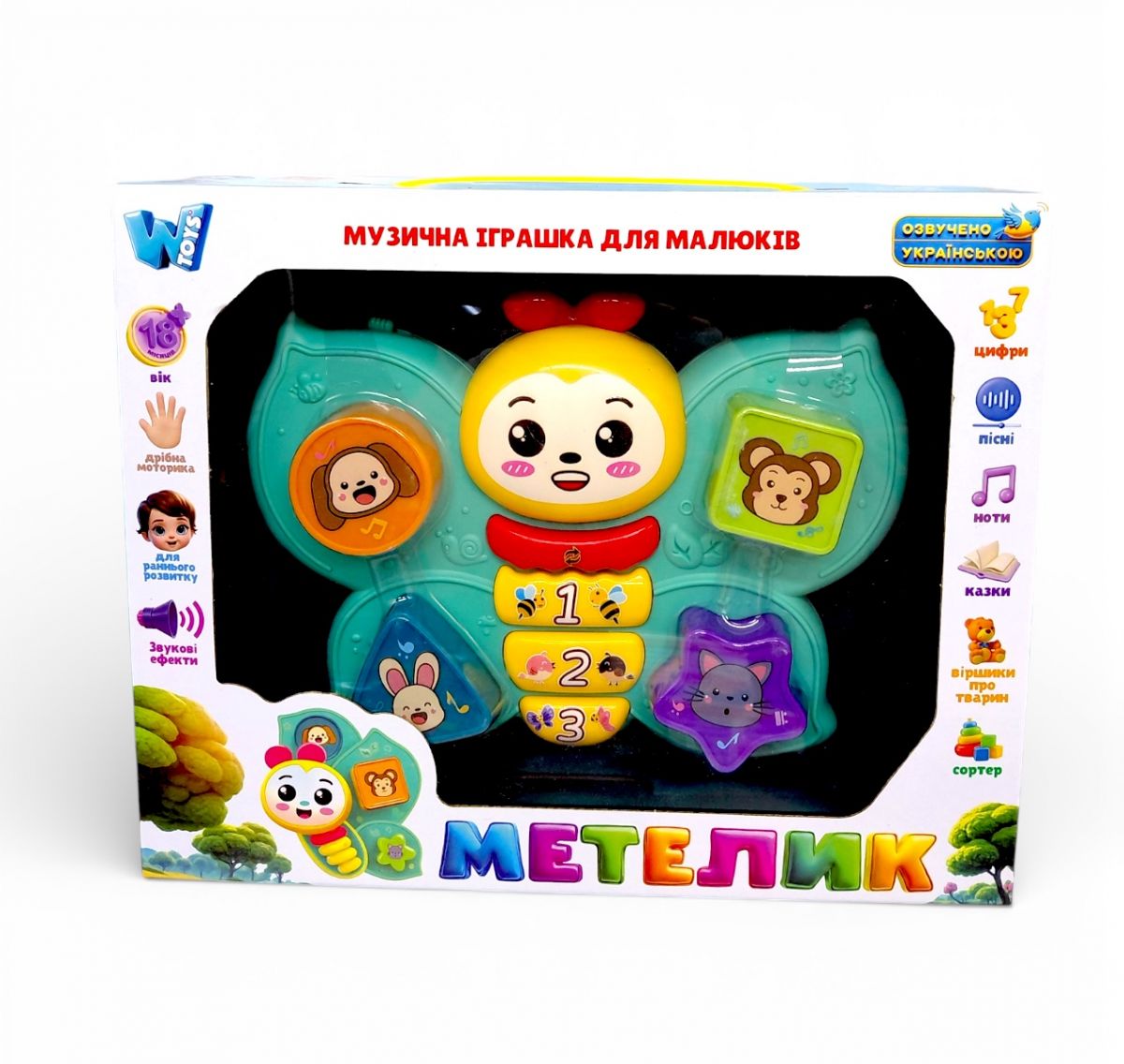 Музичний метелик, ОЗВУЧУВАННЯ УКРАЇНСЬКОЮ МОВОЮ, пісні, мелодії, загадки, звуки тварин, підсвічування, сортер, в коробці МІС 47411