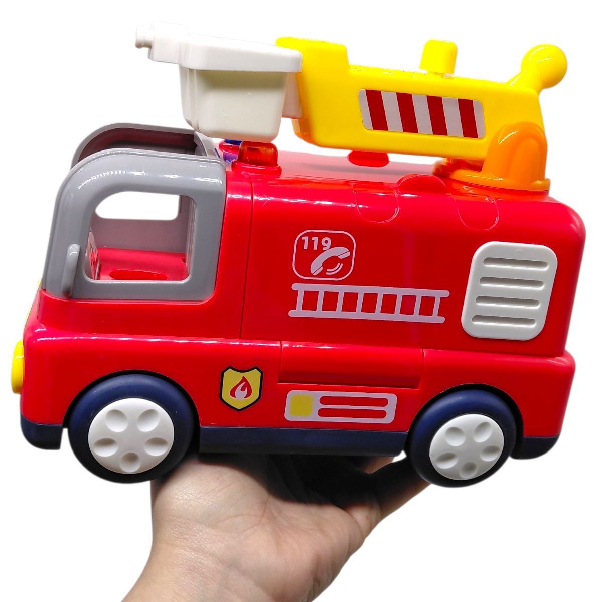 Музична пожежна машинка, виконана у яскравому дизайні класичного пожежного автомобіля. Іграшка оснащена світловими ефектами, сиреною та звуковими режимами, що відтворюють пісні, віршики та тематичні фрази.