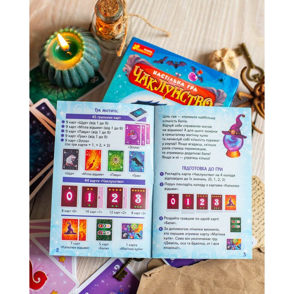 45 гральних карт, 44 карти "Чаклунство", 7 карт "Капелюх відьми", 5 карт "Бали", 1 карта "Магічна куля", правила гри |