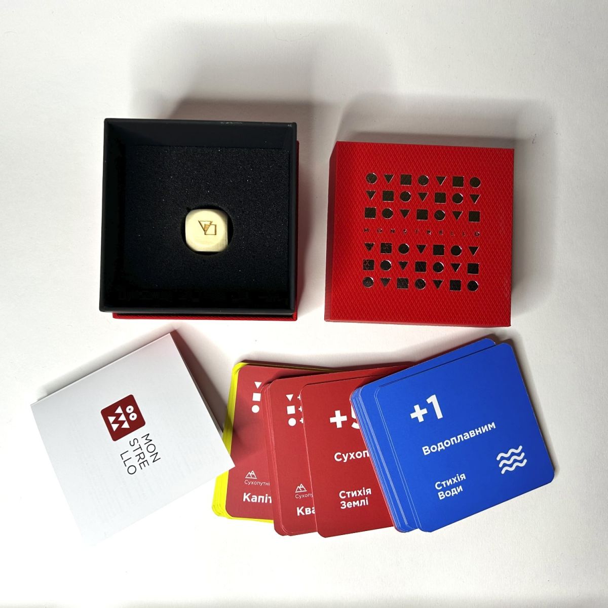 39 карток: 30 карток персонажів (по 10 для кожної стихії: Земля, Повітря, Вода), 9 бонусних карток (по 3 для кожної стихії), кубик, інструкція |