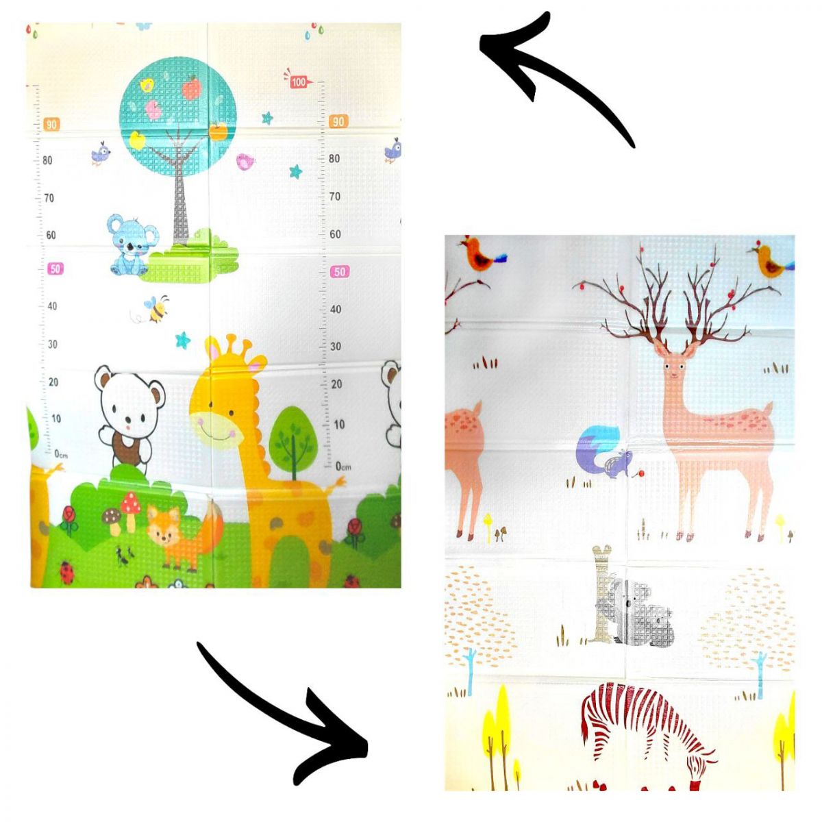 Двосторонній дитячий ігровий килимок EVA створений для комфортних і безпечних ігор дитини вдома. М’яка термооснова добре ізолює від холодної підлоги та забезпечує приємну поверхню для повзання, ігор і відпочинку. Килимок має яскравий дитячий дизайн із зображеннями тварин та елементами ростоміра, що робить його не лише практичним, а й цікавим для малюків.